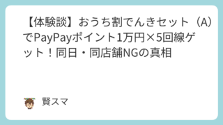 スマホ・ケイタイ契約 【体験談】おうち割でんきセット(A)でPayPayポイント1万円×5回線ゲット!同日・同店舗NGの真相 【更新情報】「おうち割でんきセット(E)加入キャンペーン ①」への対応について本記事は旧キャンペーン「でんきセット(A)」時代の攻略記録だが、規約の核心となる複数回線適用の解釈(同日・同店舗アウト説)は、最新の「でんきセット(E)」でも同様... 2025.09.02 スマホ・ケイタイ契約