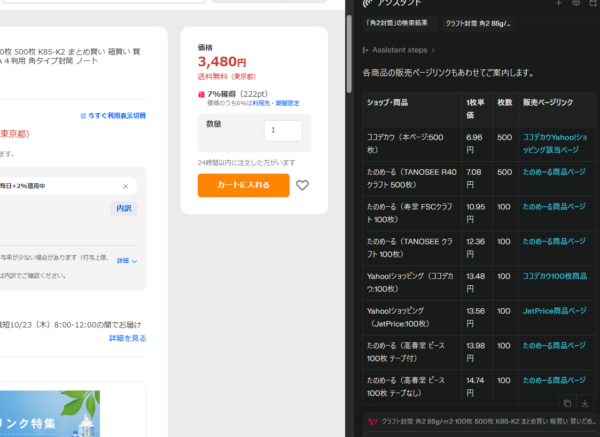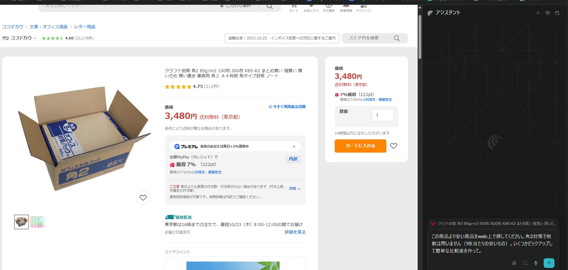 たとえばこれは封筒を探している管理人がアシスタント機能を使ってより安いものを探してくれと頼んだものだ。