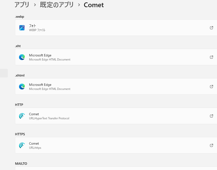 Windowsでは設定→アプリ→規定のアプリ→Cometと進んで設定する。