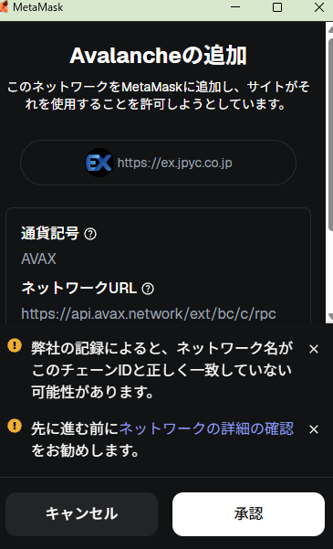 1. そのまま承認、アバランチネットワークをMetaMaskに追加する。