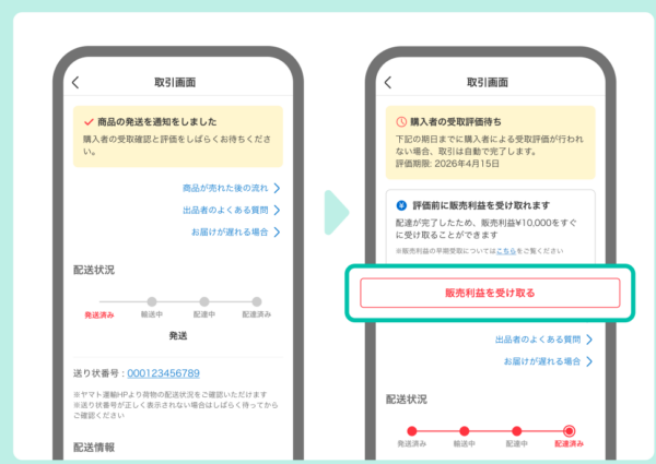 通常の対象取引では、取引画面で配送状況が「配達済み」と表示されてから24時間が経過すると、「販売利益を受け取る」ボタンが表示される。