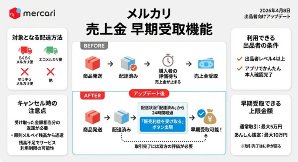 2026年4月8日、メルカリが出品者にとって実用性の高いアップデートを発表した。一定条件を満たした出品者であれば、購入者からの評価を待たずに売上金を受け取れるようになったのである。