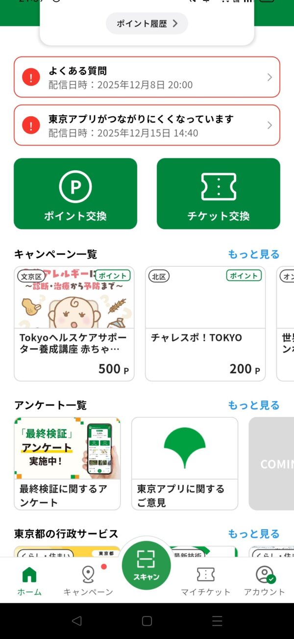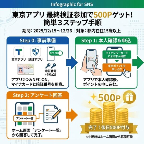 東京都は現在、東京都公式アプリ(愛称:東京アプリ)の最終検証を都民参加型で実施している。この検証に参加し、所定の手続きを完了した都民には、特典として「東京ポイント」500ポイントが付与されるキャンペーンが実施されている。