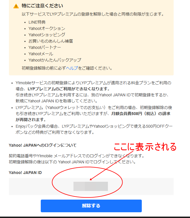 このページに表示されるYahoo! JAPAN IDが、その電話番号に初期登録されている正確なIDだ。(あくまで確認のためなのだから間違ってそのまま解除しないこと!)